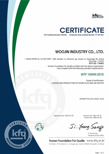In order to implement the quality policy of 「Company-wide customer response」, a quality system based on IATF16949 standard requirements and customer special requirements (CSR) has been established and is in operation. All employees of Woojin Industry Co., Ltd. understand, implement, and maintain all requirements stipulated in the quality management system, and are doing their best to satisfy customers through continuous quality improvement.